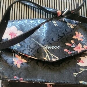 Elegant Guess crossbody bag with black and pink floral pattern. Ideal for any occasion. Can't guarantee authenticity.