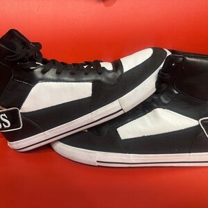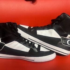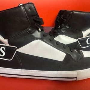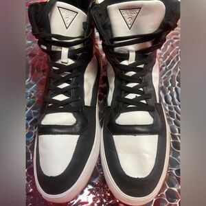 Step out in style with these Guess high-top sneakers, showcasing a bold black and white color palette. The sleek design features a contrasting upper and a comfortable white sole, perfect for adding a touch of flair to your casual ensemble.