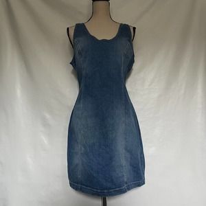 Stylish denim dress. Sleeveless design. Perfect for casual outings. Zipper clasp at top is a little bent but still works.