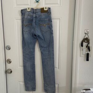 Classic blue denim jeans with a stylish design. Features a red Guess label for a bold touch. In good condition some pilling and there are stains on the interior pockets. sold as pictured inseam is 32 inches