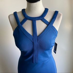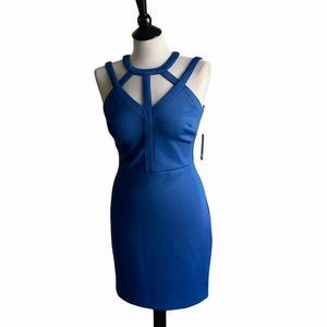Stylish blue mini dress. Features a unique neckline. Perfect for any occasion.