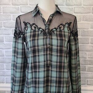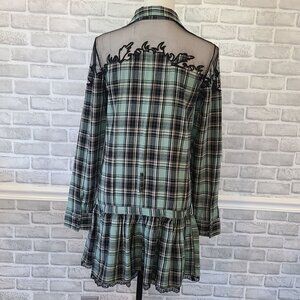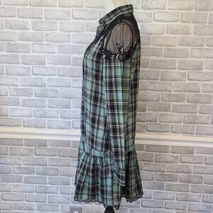 Guess Blue Plaid Drop Waist Dress Oversized Sheer Shoulder Western Grunge XS