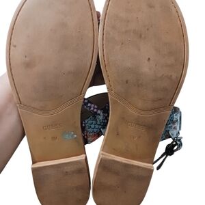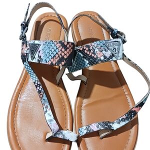 Chic sandals with a snakeskin pattern. Features blue and pink hues. Stylish and comfortable for any outing.