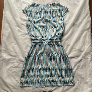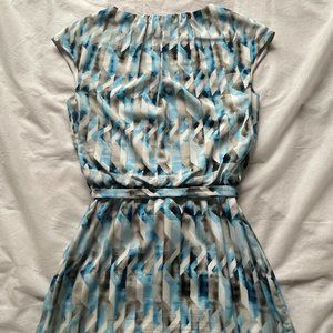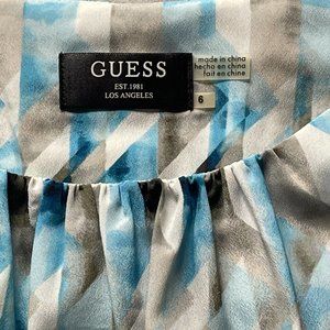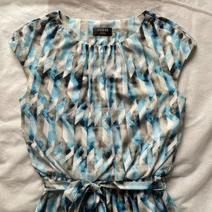 Blue, white, black and dark gray geometric design with silver button detail on the shoulders.