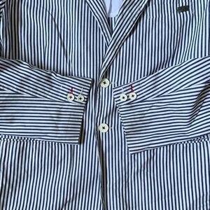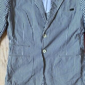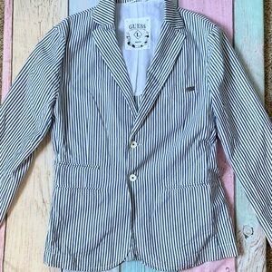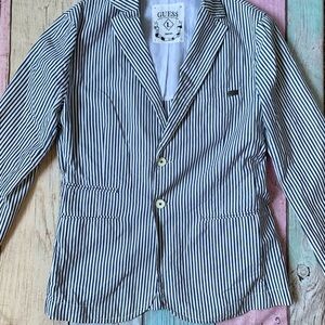 Guess white and blue stripes blazer. In good pre owned condition. Little bit of yellowing in the back of the neck as shown in pictures. Love the stripes in this blazer throw it over any outfit to make it stand out! No stretch. No rips.