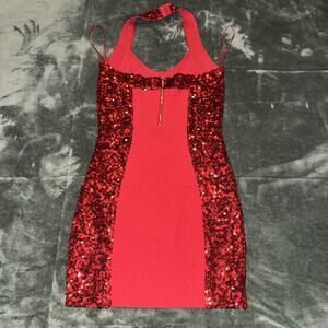 Guess Bodycon Dress Women's Small Red Sequin Halter Neck Back Zipper Cocktail.