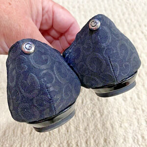 Guess Brand Slip On Casual Shoes in ladies US size 8M done in a black on black logo print textile upper. Elevate your look with these flats that feature a silver-tone metal faux buckle and studs with logo details and a low 1/4" heel covered with black patent. In excellent pre-owned condition - minor overall wear - no damage or flaws - the perfect way to combine style and comfort!