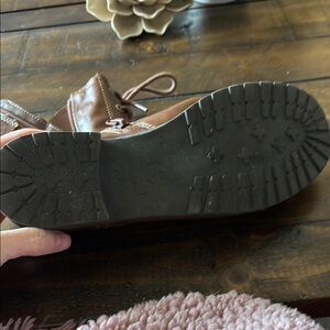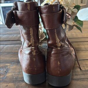 These Guess combat boots showcase a rich brown leather with a rugged, textured finish. Featuring a decorative buckle strap and sturdy rubber sole, they combine style with durability. The ankle-high design and metal eyelets add a touch of military-inspired flair.