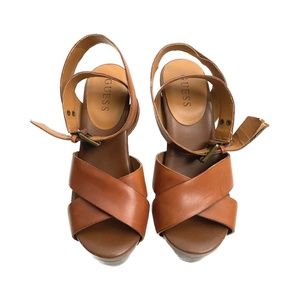 Gorgeous GWLOPRAN leather Guess brand heeled sandals. Thick brown leather straps that wrap around back and buckle on the sides. The base of this shoe is wooden. Brass buckle and rivets. Pictured are a few nicks and scratches, nothing too noticeable when worn.