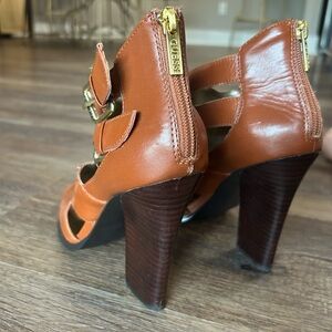 Chic brown sandals with open-toe design. Features a stylish block heel. Ideal for versatile wear. Easy off/on with zipper in back!