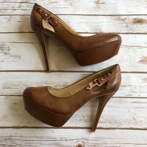 Vegan leather brown platform heels with buckle detailing. Gently used condition. Size 9M.