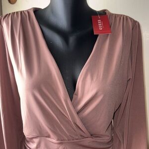 Elegant brown wrap blouse. Long sleeves with cuffed ends. Perfect for versatile styling.