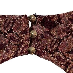 Guess Burgundy Gold Metallic Lace Bodycon Open Back Dress Size 0 Cocktail Fairy Glam Sexy. Sheer lace over lining. Some stretch in the fabric. Padded bust. V-neck with halter. Zipper and 3-button closure. Above knee length. In excellent preowned condition.