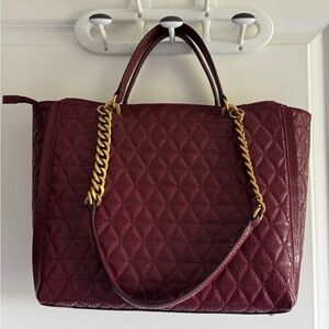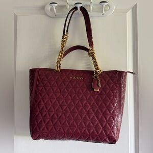 Chic Guess tote in Burgundy with quilted texture. Features gold chain handles. Stylish and versatile.