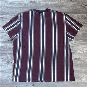Stylish short sleeve tee with bold burgundy and white stripes. Comfortable and casual design. Perfect for everyday wear.