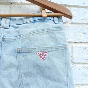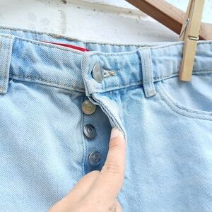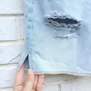 Stylish light blue denim shorts with a trendy distressed look. Perfect for casual outings. Good condition, Women's size 8. Approximate flat lay measurements Waist 14.5 inches, Rise 9.5 inches, Inseam 5 inches.