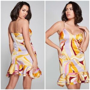 Dance until sunup in this vibrant print dress featuring a plunging neckline, chain straps, back zip closure and a ruffle hem.