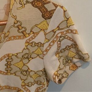 Guess Chain Print Ribbed Top. Gold, Brown and Cream. Y2K inspired all-over chain and medallion print, ribbed tee, scoop neck with 3 snap detail, short sleeve, cotton/elastane blend. Gently used, excellent condition, no stains or tears, see pictures for details.