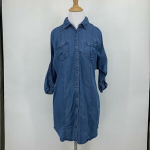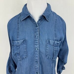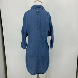 GUESS CHAMBRAY DENIM DRESS WOMEN SIZE XS MID CUTOUT SLEEVES BUTTON FRONT POCKETS