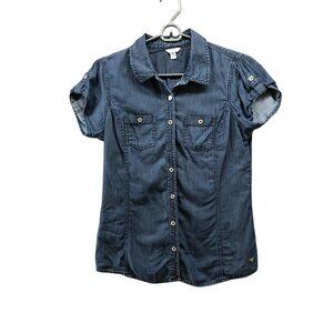 Guess Chambray Utility Shirt Womens M Short Sleeve Button Up Cotton