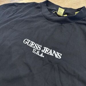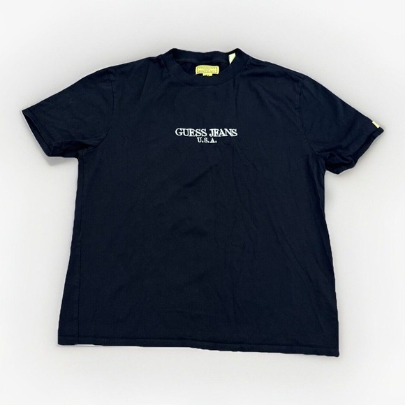 This Guess Chinatown Market Shirt is a stylish men's T-shirt in size M, made of a comfortable cotton blend jersey fabric in black color. It features an embroidered question mark smiley design, adding a touch of unique streetwear flair. The shirt is part of the collaboration between Guess and Chinatown Market, showcasing a classic USA theme with colorful accents. Perfect for all seasons, this regular fit shirt is machine washable and ideal for casual, everyday wear.