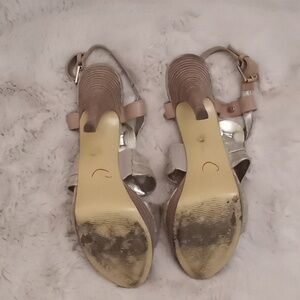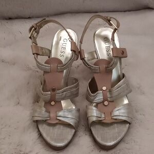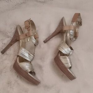 Guess Classic Light Tan and Gilded Golden Shimmer Linen Effect Heels with Platform, Wood Stacked heel is 5", few unnoticeable scuffs on heel and inside band(pics), Neutral, Coastal, Capsule Wardrobe, Classic, Spring, Summer, Brunch, Wedding,
