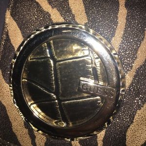 Tan and brown animal print with glitter shimmer throughout. Inside is a cute pink color with a zipper pocket and a magnetic closure. Flawless. Used only once!
