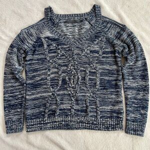 Guess 100% Cotton blue and white heathered cold shoulder v-neck sweater with ribbed trim in size M | Medium