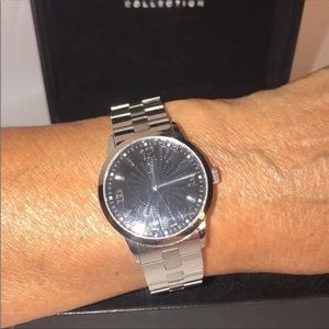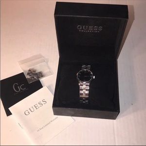 Guess Collection black face, solid stainless steel watch. No scratches on the face. extra links included and box as well. Few scratches on links (pictured-nothing major) needs battery.