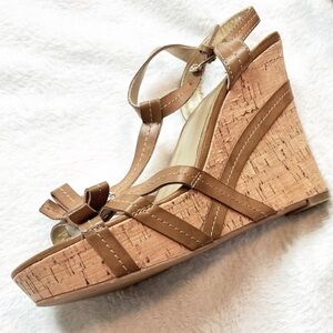 Guess Cork Wedge Sandals Leather Strappy Brown Bow Tan Size 8.5 M 5” Heel