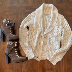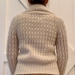 - Cream colored knit sweater - 4 front buttons and folded collar - Size small - No damage