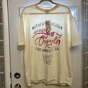 Guess branded short sleeve tee in cream. Bold red scripted logo and graphic text on front. Lightweight casual style suitable for everyday wear. Crew neckline and relaxed cut.
