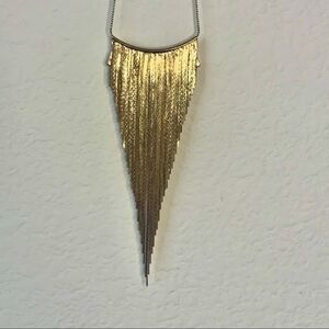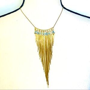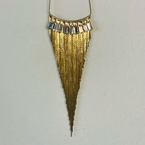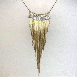 Stunning Statement Necklace, Features large crystals hanging from a gold collar with gold Chain Fringe.