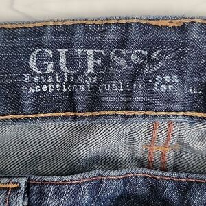 Classic 5 pocket styling bootcut blue denim jeans by Guess with a low-rise, embroidered pockets, and manufacturer distressing including fading, whiskering, knee tears, and frayed hems. See pictures. These jeans are in great overall condition, but they have a weird faded mark. It looks like it was from a size sticker. Because of the distressing, it blends pretty well.