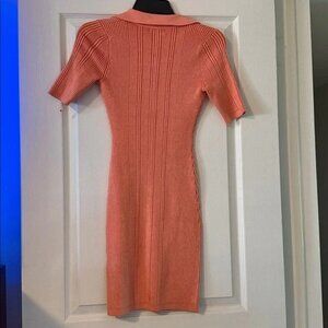 Chic coral mini dress with ribbed texture. Features a stylish collar and short sleeves. Perfect for a night out. LARGE