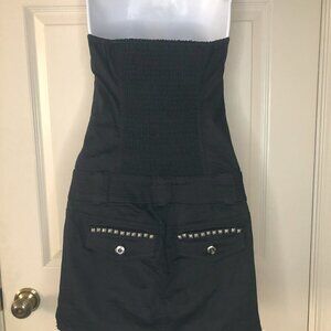 Guess denim skirtall. Zippers are functional. Spike rivets details in the belt buckles and back pockets. Cup is padded and have wires. Smocking detail in the back for stretch.