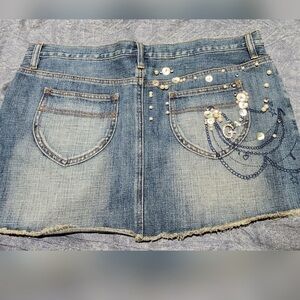 Denim five-pocket mini skirt with embellishments consisting of rhinestones, pearls and paillettes on a front and back pocket. Mini skirt has a frayed raw hem.