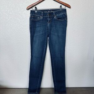 Women’s size 28 G by Guess dark wash denim super skinny jeans in good used condition. Good preowned condition with minor overall wear and no flaws. Clean nonsmoking home. Approx 14” across waist laid flat, 29” inseam, 7” rise.