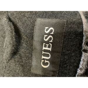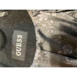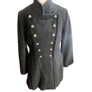 Gorgeous brand new Guess black lama peacoat that is double breasted with silver accent buttons and flowered silk lining. Just took tags off to try on and never wore it and now it does not fit. PTP 19, shoulder to hem 35 , arm length 25. Absolutely stunning coat. It looks faded in pictures but I can assure you it is dark black and not faded as it is new.
