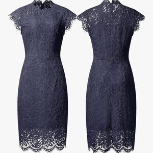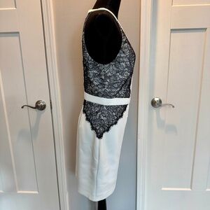 Guess Dress, white with black lace overlay, L, EUC, back zip closure. Straight fit, fully line, back zip closure, halter neckline and peep hole. Hits at knee. Polyester. Measurements: 17" arm pit to arm pit and 33 1/2" length.
