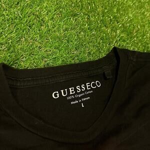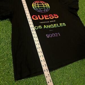 ☆ Features: Black t-shirt with vibrant rainbow globe graphic, "Guess" branding, and "Los Angeles" lettering. Perfect for eco-conscious fashion lovers and streetwear enthusiasts.