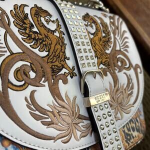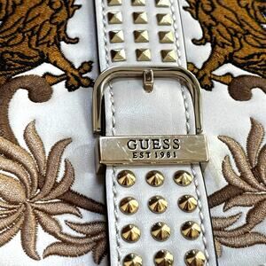 Elevate your style with this Guess Eileen purse, a stunning baroque convertible crossbody bag, perfect as a shoulder purse. This bag is ready to add a touch of elegance to your wardrobe. The chic chain strap and silver studs enhance its overall appeal. It can be used 2-ways for a variety of looks. Good overall condition with minor wear (see pics) but no significant damage or flaws - just stunning!
