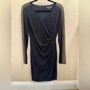 This elegant black dress features stunning gold accents on the sleeves, perfect for any special occasion. Its sleek design and sophisticated style make it a must-have in your wardrobe.
