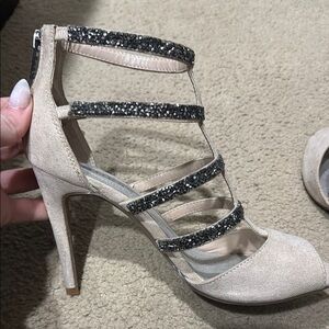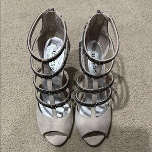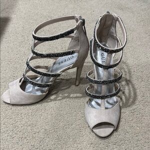 Elevate your style with these Guess heels, showcasing a chic black and cream design. The strappy silhouette and high stiletto heel add a touch of elegance to any outfit. Secure them comfortably with the sleek ankle closure for a flawless fit.
