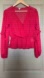 Stylish crimson blouse with a wrap front. Features long sleeves and ruffle accents. Ideal for a chic ensemble. Front button close.