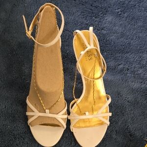 Lightly worn, pre-owned. Ankle straps, the gold is flaking internally but not visible when on. One spot of gold on the ball of one shoe is also peeled off but again not visible while wearing. See pictures. Still ver unique and great for a night out
