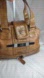 The GUESS Tan Faux Leather Croc Embossed Satchel is a stylish and versatile handbag perfect for any fashion-forward woman. This medium-sized satchel features a rectangular shape with a zip and magnetic closure, making it ideal for everyday use. The tan exterior with silver hardware accents gives it a chic and classic look, while the brown double handles add a touch of sophistication. With inner pockets for organization, this vintage-inspired bag is a must-have for any designer bag collection. Has a bottom zippered around compartment. 15"x9" x6" *callouts small peeling inside of handle see pics*