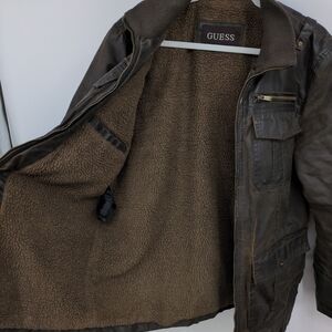 Guess Faux Leather Men's Medium Bomber Jacket Sherpa Lined Field Cargo Military Chocolate Brown. Good used condition, some signs of wear throughout including a missing button on one front pocket and some light pilling on the collar.
