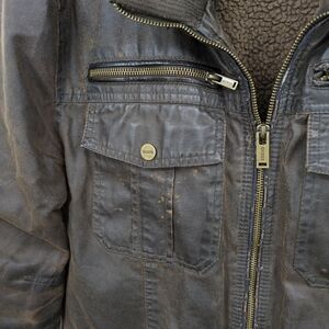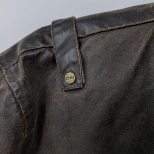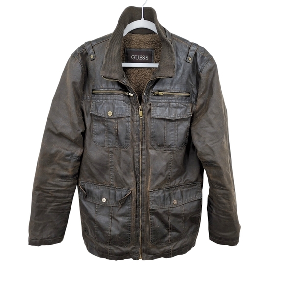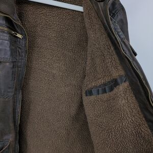Guess Faux Leather Men's Medium Bomber Jacket Sherpa Lined Field Cargo Military Chocolate Brown. Good used condition, some signs of wear throughout including a missing button on one front pocket and some light pilling on the collar.
