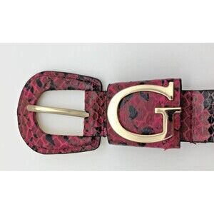 The Guess Faux Snakeskin Belt in pink with a gold logo buckle is a stylish fashion accessory for women. Made from faux leather with a medium belt width, this belt features a stainless steel hardware material and a Western, designer theme with accents like the buckle and logo. The colorful and novelty design adds a touch of rock and rockabilly flair to any outfit, making it a trendy and eye-catching piece for any wardrobe.